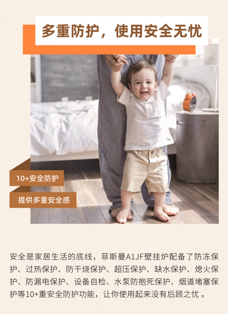 安全是家居生活的底線,菲斯曼A1JF壁掛爐配備了防凍保護、過熱保護、防干燒保護、超壓保護、缺水保護、熄火保護、防漏電保護、設備自檢、水泵防抱死保護、煙道堵塞保護等10+重安全防護功能,讓你使用起來沒有后顧之憂。