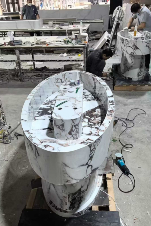 如果你的工程不管用那個品牌的巖板或者陶瓷,在轉角需要熱彎的,他們的板不能彎,沒關系,轉角彎的地方用我們的熱彎板,我來調顏色和他的巖板或者陶瓷來對色,熱彎燒制出來的產品兩個顏色可達到95%以上的相似度。