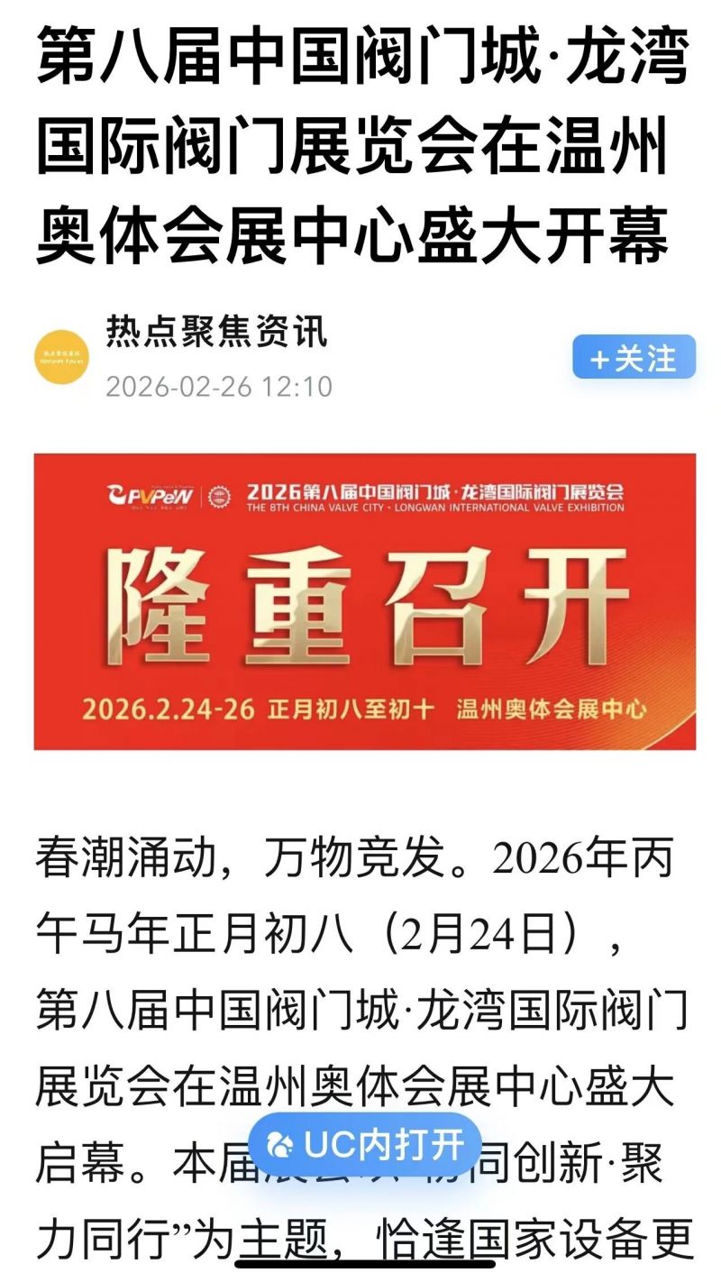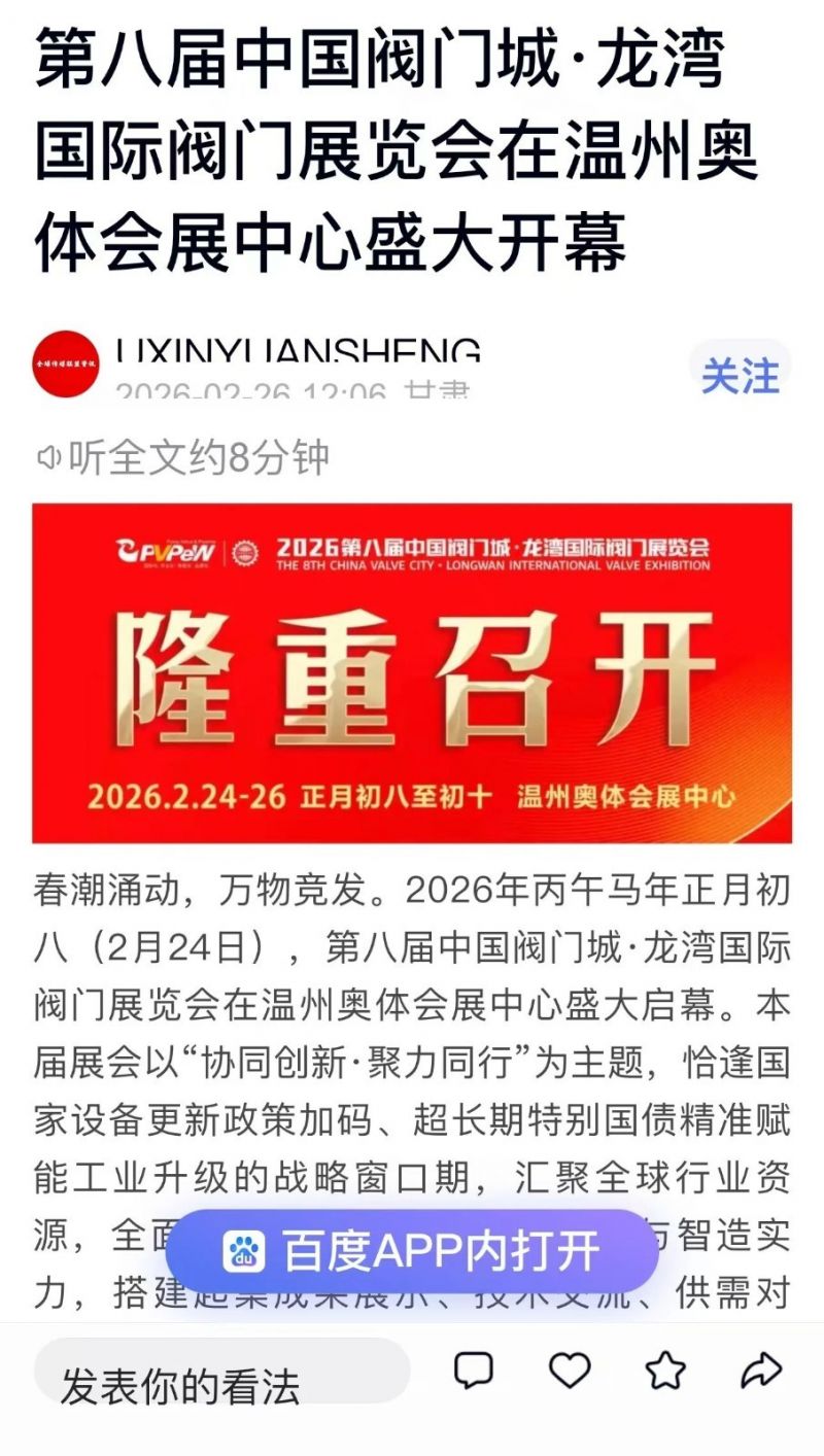 2026年2月24-26日,為期三天的第八屆中國閥門城·龍灣國際閥門展覽會在溫州奧體會展中心圓滿閉幕。作為丙午馬年開年專業盛會,本屆展會以協同創新·聚力同行為主題,匯聚全球閥門產業鏈資源,集展示、交流、對接、合作于一體,為龍灣閥門產業乃至全國閥門行業注入強勁動能。