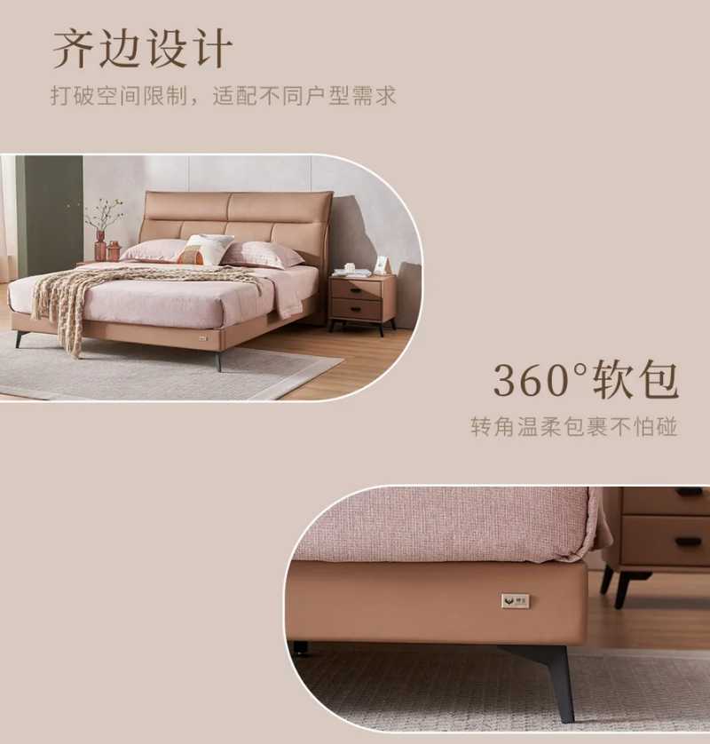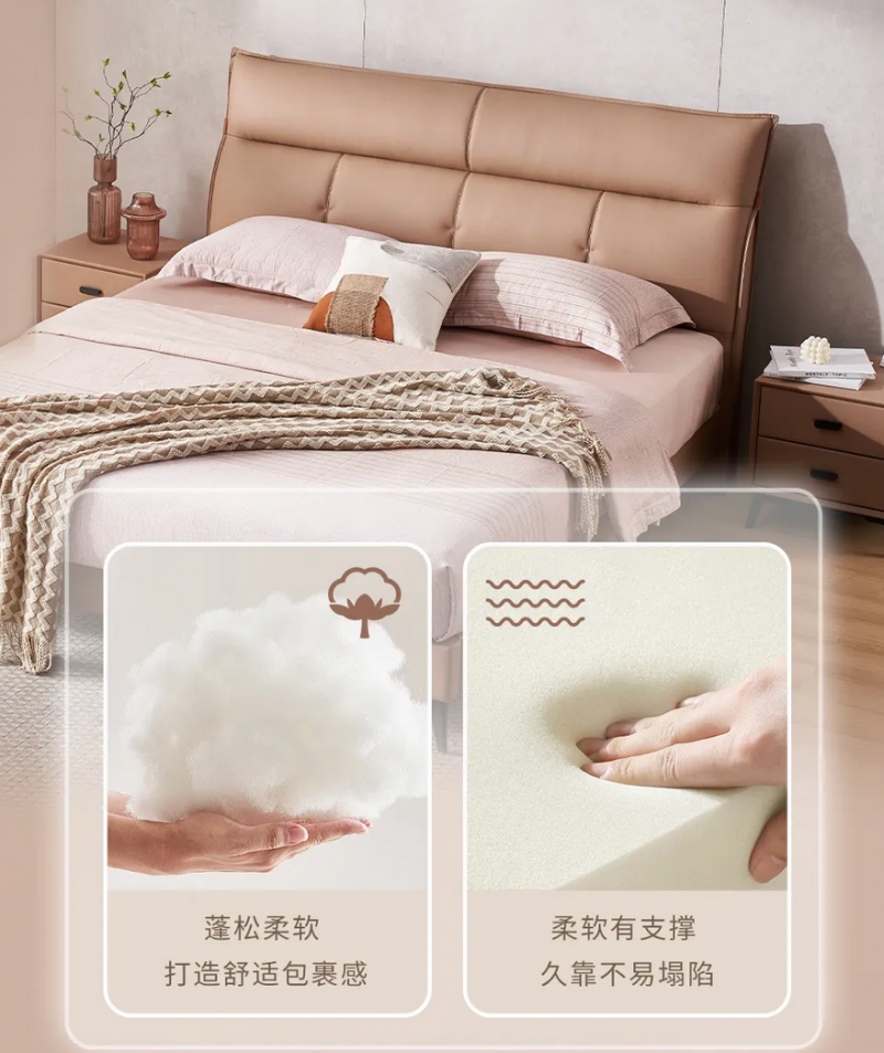 穗寶集團梵洛貝在材質選擇上同樣秉持嚴苛標準,力求兼顧舒適觸感與長久耐用。外層選用頭層黃牛皮胚料,優選疤痕少、皮質緊實的優質皮張,最大程度還原頭層牛皮的天然肌理,讓床體外觀立體飽滿,觸感細膩溫潤。內層創新填充7孔纖維棉與高密度海綿組合,兩種材質的精妙融合,讓靠包兼具飽滿蓬松的觸感與持久回彈的特性,即便長期倚靠也不易變形塌陷,完美平衡實用性與舒適感。
