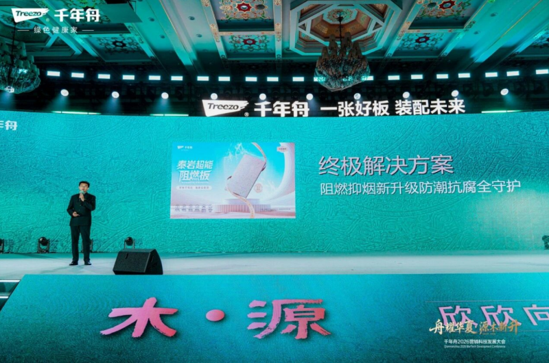 科技賦能工程建設,綠色引領行業未來。在千年舟2026年服務商&供應商營銷科技發展大會上,一款專為工程打底板場景研發的新型防火防潮綠色環保板材——泰巖超能阻燃板新品重磅發布!這款以泰巖板基材為核心,通過冷壓成型工藝壓制而成,兼具隔熱性能;可有效解決工程打底板易吸潮、阻燃不穩定、環保不達標等痛點,滿足現代工程對板材多功能性與安全性的雙重需求。