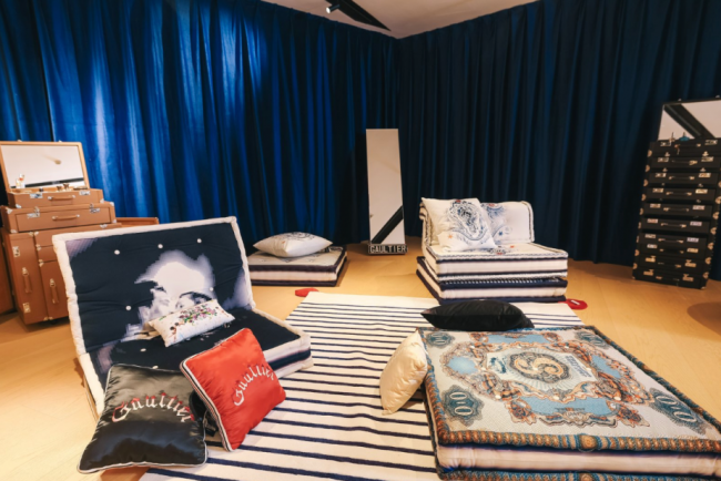 與“時尚頑童”Jean Paul Gaultier 的合作版本,則展現出另一種大膽率真的設計態度。JPG 將其標志性的水手條紋與高級時裝面料結合,為Mah Jong“麻將”沙發賦予鮮明的個性印記。現場宛如一場正在進行的時尚大片拍攝:沙發模塊與抱枕自由散落于地毯之上,與其為羅奇堡設計的其他家居單品彼此呼應,在空間中交織成一場關于時尚、設計與生活方式的對話。