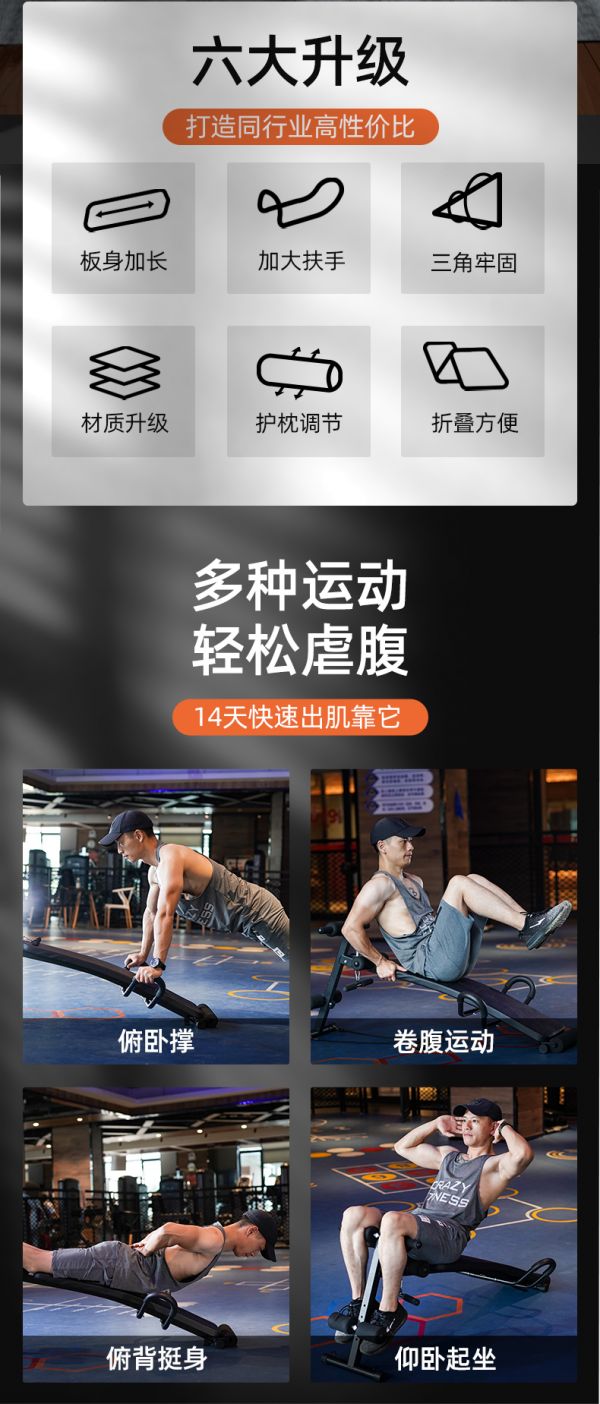 啟影健身器材仰臥起坐板做仰臥起坐最好腰部不要離開仰臥板,身體卷起來的感覺,起來的時候主動收腹呼氣,下來的時候吸氣。也就是卷腹。傳統的仰臥起坐,腰部借力很多,也傷害到腰椎。效果沒卷腹效果好。