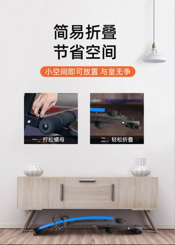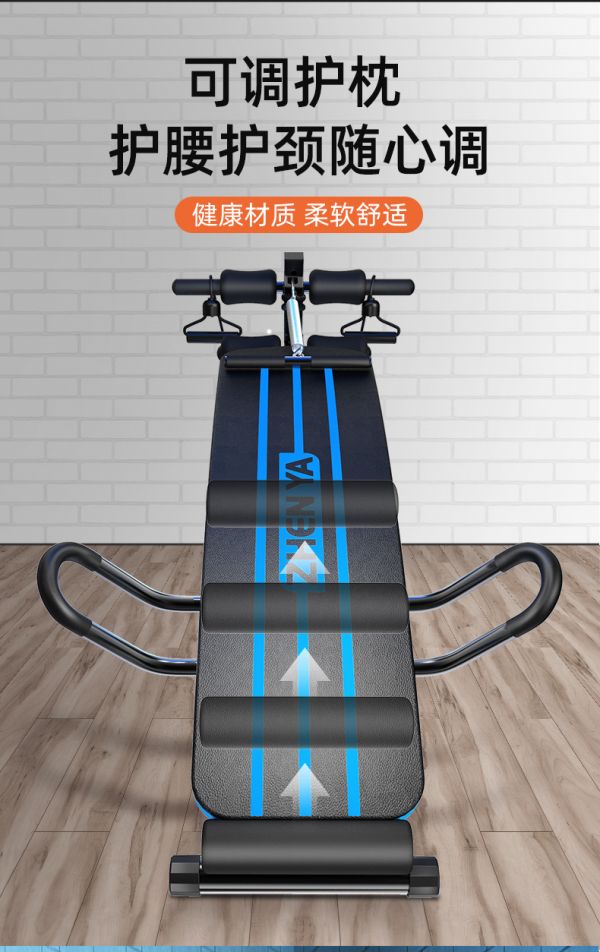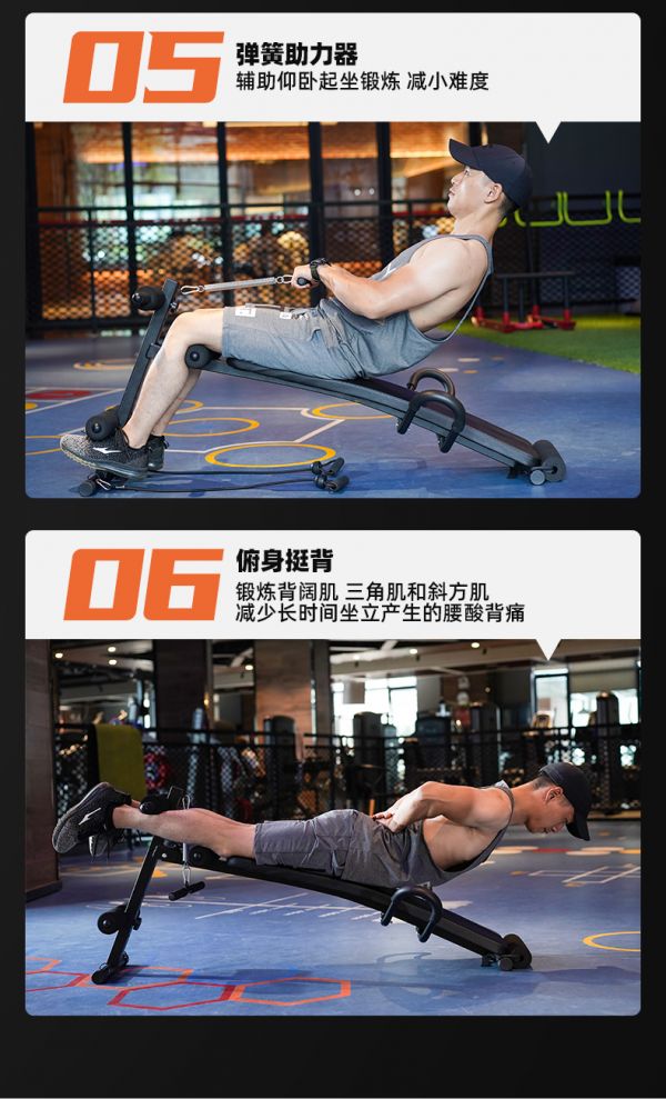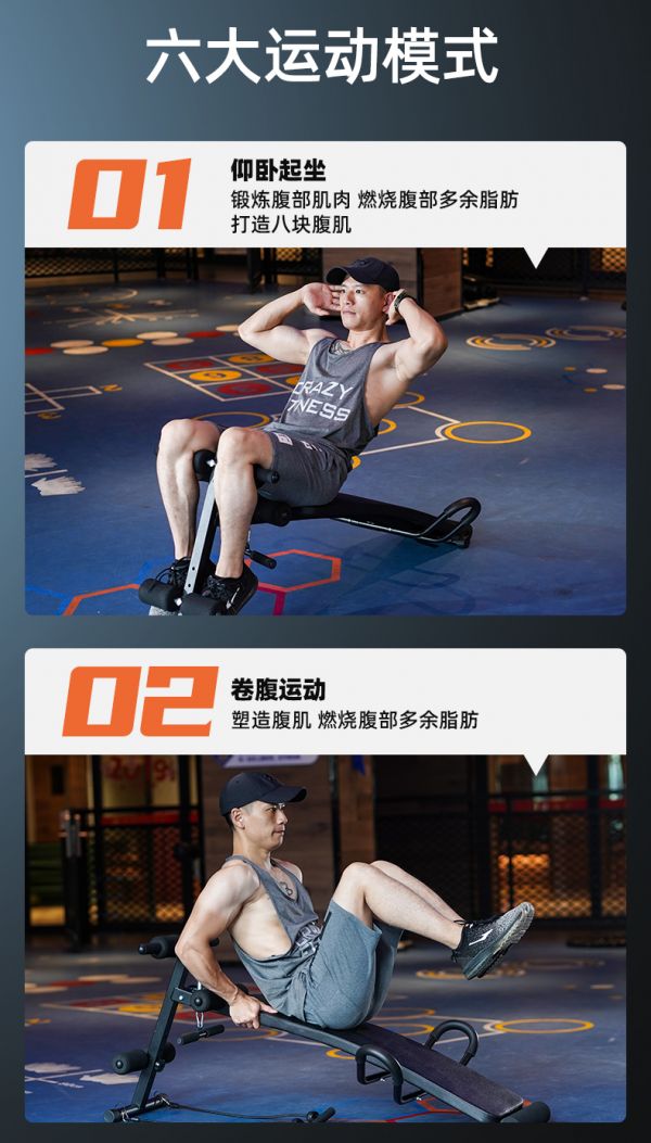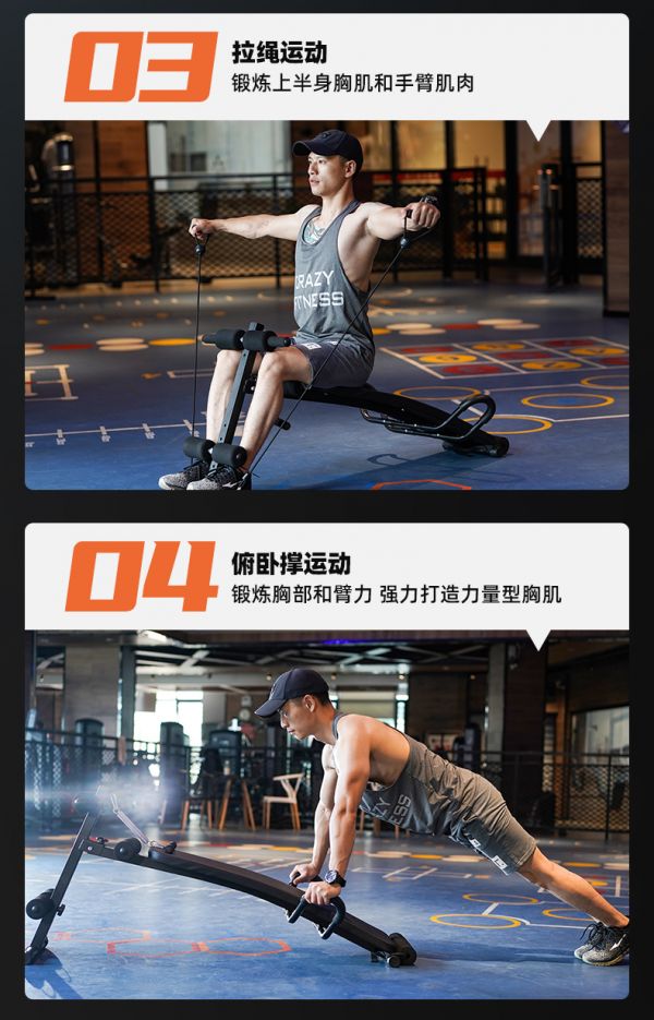 2、一機七用,含納了仰臥起坐,收腹運動,仰臥抬腿,蹬車運動,拉繩曲臂,直臂平舉,俯臥撐等7種健身方式,全效塑形;