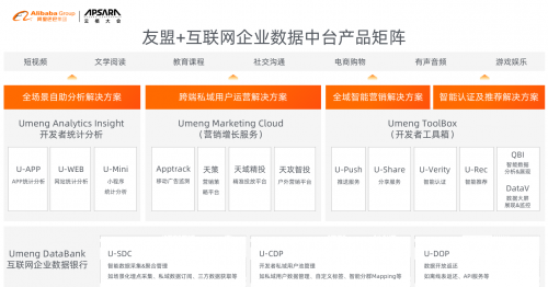 在過去的十年中,友盟+服務(wù)了890萬網(wǎng)站和200萬App。憑借服務(wù)千萬家企業(yè)的經(jīng)驗,友盟+面向企業(yè)推出互聯(lián)網(wǎng)企業(yè)數(shù)據(jù)中臺解決方案。通過開發(fā)者統(tǒng)計分析服務(wù)、營銷增長服務(wù)以及開發(fā)者工具箱,為企業(yè)提供智能化數(shù)據(jù)服務(wù)及增長體系。同時,基于所有數(shù)據(jù)服務(wù)的底座——友盟+互聯(lián)網(wǎng)企業(yè)數(shù)據(jù)銀行,通過多端數(shù)據(jù)沉淀,幫助開發(fā)者完成全場景、全觸點的數(shù)據(jù)資產(chǎn)沉淀及應(yīng)用的管理。整個體系將為企業(yè)的業(yè)務(wù)數(shù)字化、決策數(shù)字化、營銷數(shù)字化和運營數(shù)字化提供源源不斷的動力。
