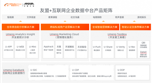 友盟+互聯網企業數據中臺的產品矩陣包括開發者統計分析產品系列、營銷增長產品系列、開發者工具箱產品系列和互聯網企業數據銀行四大部分。