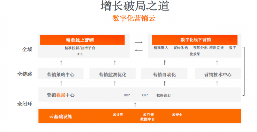 數字化營銷云分為三層,最底層是云基礎設施,包括云計算、云存儲、云安全和數據中臺,它們為企業實現用戶增長和數字化營銷提供了穩固的基礎保障。第二層是全鏈路的技術能力,包括營銷策略中心、營銷監測優化中心、營銷技術中心、營銷數據中心等。營銷數據中心又包含了DMP、CDP等,以及友盟+的互聯網企業數據銀行。最上層是面向企業的目標用戶,實現精準的數字化線下營銷,以及精準拉新和拉活的線上營銷平臺。