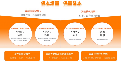 友盟+天域RTA覆蓋兩個(gè)核心場(chǎng)景:一、基礎(chǔ)營(yíng)銷場(chǎng)景。拉新中,達(dá)到拉新激活成本降低,通過(guò)個(gè)性化拉新,排除無(wú)效流量;拉活中,依據(jù)客戶定制靈活的的“促活場(chǎng)景”模型設(shè)計(jì)與質(zhì)量分析,滿足多策略拉活人群圈選;二、深度轉(zhuǎn)化場(chǎng)景,依據(jù)友盟+天域RTA獨(dú)有的優(yōu)勢(shì),深度轉(zhuǎn)化以及后鏈路數(shù)據(jù)場(chǎng)景,如付費(fèi)、次留等可實(shí)現(xiàn)保量降本的效果。
