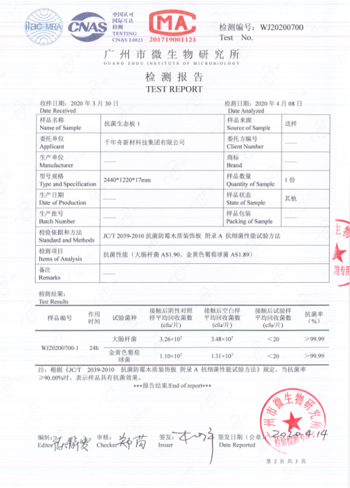 千年舟光觸媒抗菌生態板二氧化鈦能夠快速的發生催化反應,減少細菌在抑制或分解前就轉移的風險。抗菌性能優,可有效抑制、分解金黃色葡萄球菌,大腸桿菌、銅綠假單胞菌、肺炎克雷伯菌,抗菌率可達99.99%。