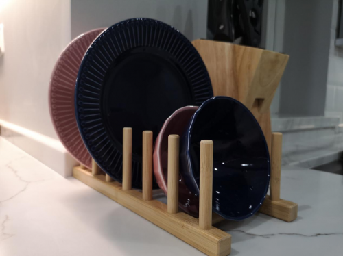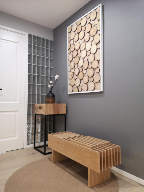 色彩在空間中是可以流動的,它們相互呼應(yīng),相互補(bǔ)充。亭頤的這次老房改造對色彩的把控側(cè)重于柔性美感,這就意味著在裝飾材料的材質(zhì)、色彩、圖案、紋理的選擇上需要著重選擇。比如,錫灰色大面積使用作為背景色,凸現(xiàn)出簡約平和的現(xiàn)代感。胡桃木的茶幾和單柜,小巧的木質(zhì)置物架和整齊劃一的楓葉色格子櫥柜,用流動的色彩延續(xù)設(shè)計風(fēng)格。玄關(guān)處幾何疊加設(shè)計感的木凳用色清透干凈,墻上的年輪壁畫象征著時間與自然,柔和的曲線之美配以木質(zhì)專有的色澤,既有藝術(shù)感又不失親和力。