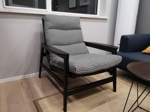 因為觀念的一致,亭頤設(shè)計可謂是面面俱到,將自由與藝術(shù)的理念注入日常所需之物的設(shè)計擺放中??蛷d中的簡白格子單人椅可供她裹著羊毛披肩卷縮一團(tuán)聽著音樂沉沉睡去。或者窩在沙發(fā)上一本書度過一個慵懶的下午,直到落日余暉穿過窗戶落在她的身上,起身去小小吧臺處為自己做一杯咖啡。
