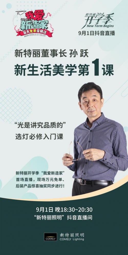 9月1日,新特麗以開學第一課的形式,作為活動正式面向全國啟動的首發儀式。新特麗董事長兼首席設計師——孫躍先生親臨直播間,演講了主題為“新生活美學”的開學第一課,以簡單、有趣的方式,分享從專業角度及以用戶需求出發,如何在家居環境中選擇和布置燈光,讓家居燈光更健康并富有設計美感和情調。