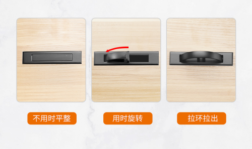 卡貝這款隱形拉手采用了嵌入式、可旋轉的設計。不用的時候隱藏,呈現出平整的狀態,需要用的時候旋轉將拉環拉出。這種設計使拉手不容易落灰,同時弱化拉手的存在感,使柜面整體觀感整潔利落。