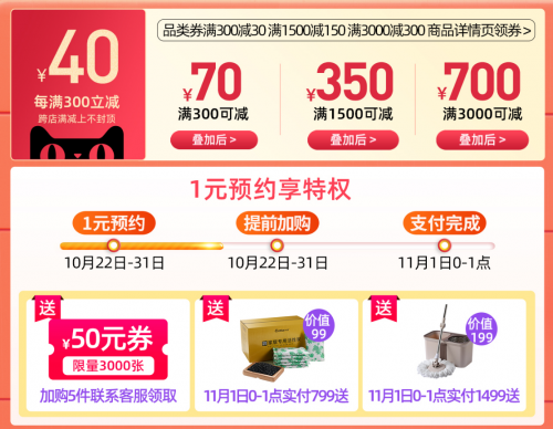 雙十一前期,卡貝特推出“一元禮包”、加購券及“入會有禮”政策。10月21日-31日購買一元禮包,即可享受滿799送活性炭禮包,滿1499送拖把套餐或垃圾桶,數量有限,先到先得;10月28日-31日,則開放3000張50元加購券;此外,新入會會員可享500-20券,老會員復購享1000-50券,會員還可參與1元秒殺、積分換禮、簽到抽獎、0元試用新品等活動。