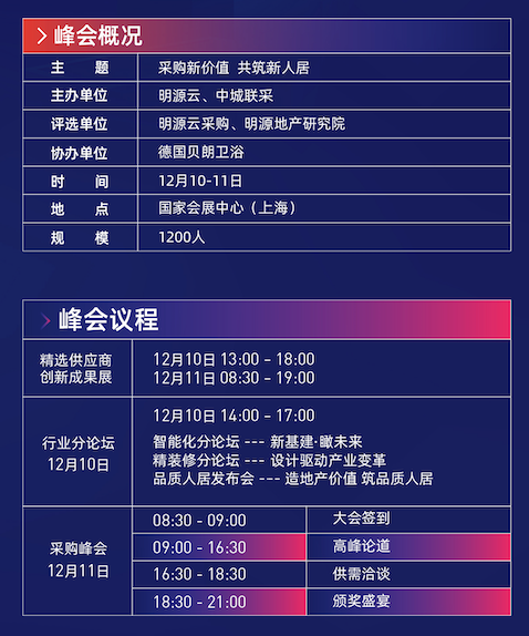 在此背景下,12月10、11日,由明源云、中城聯采聯合舉辦、德國貝朗衛浴協辦的“采購新價值,共筑新人居 ”2020中國房地產年度采購峰會&第五屆標桿開發商及優秀供應商頒獎典禮暨精選供應商創新成果展將于上海舉辦,匯聚1200余位地產采購總、精選供應商領軍人共同探討地產供應鏈創新與變革、共同見證品質新人居新未來。