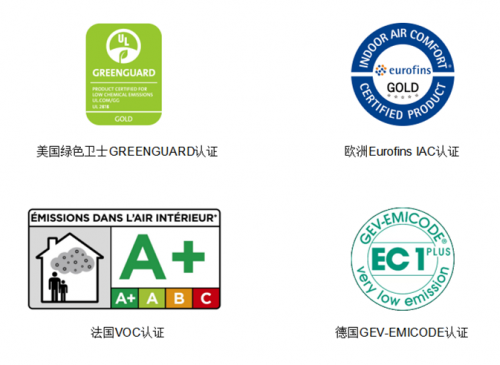 美國綠色衛(wèi)士GREENGUARD認證、歐洲Eurofins IAC認證、德國GEV EMICODE認證以及法國VOC法規(guī)認證,是對產(chǎn)品使用后在室內(nèi)或人類生活及環(huán)境中的釋放量檢測,是當今世界四大嚴苛的環(huán)保認證。