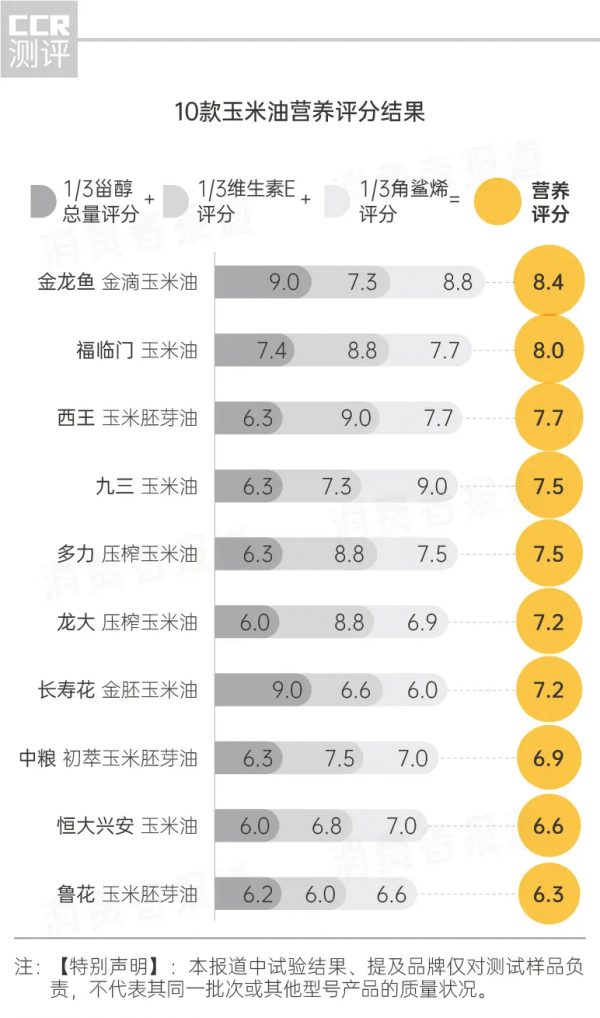4、綜合而言, 魯花玉米胚芽油的甾醇總量、維生素E、角鯊烯等3個營養指標的含量均幾乎墊底,營養評分僅有6.3; 金龍魚金滴玉米油和 福臨門玉米油營養評分分別達到8.4和8.0,表現較優。