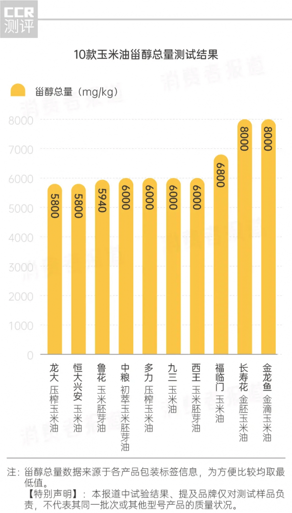 測試結果顯示, 金龍魚、 長壽花等2款玉米油的甾醇總量最高,均達到了8000mg/kg; 魯花、 恒大興安及 龍大等3款較低,分別為5940mg/kg、5800mg/kg和5800mg/kg。