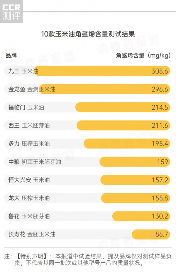 恒大興安玉米油、 福臨門玉米油、 多力壓榨玉米油、 魯花玉米胚芽油、 金龍魚金滴玉米油、 西王玉米胚芽油、 龍大壓榨玉米油及 中糧初萃玉米胚芽油的角鯊烯含量為130.2mg/kg~296.6mg/kg。