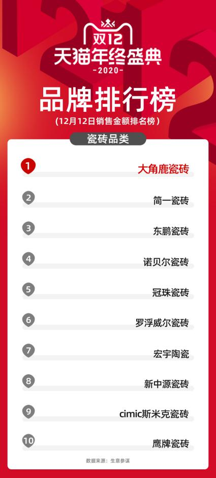 作為12月不容錯過的“雙12”購物盛典,為中國國民經濟創收注入了一劑強心劑。中國陶瓷行業“新零售”的故事也在“雙12”購物節中繼續上演——中國瓷磚新銳領先品牌:大角鹿超耐磨大理石瓷磚,在今年“雙12”全球購物狂歡季中再創佳績,以1077197累計交易指數成功斬獲天貓“雙12”陶瓷類銷量第一,成為實至名歸的“瓷磚之王”。