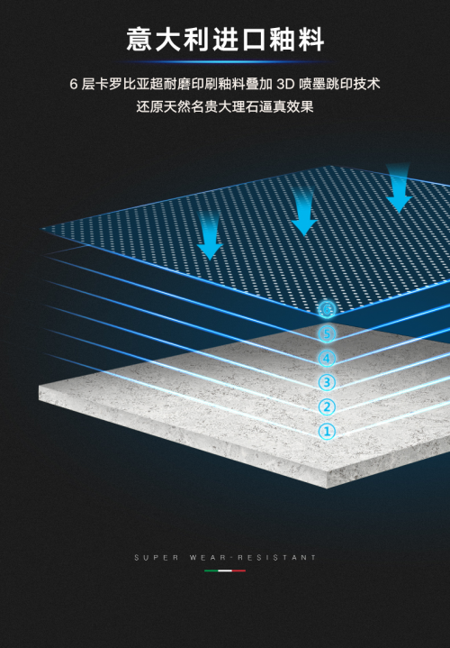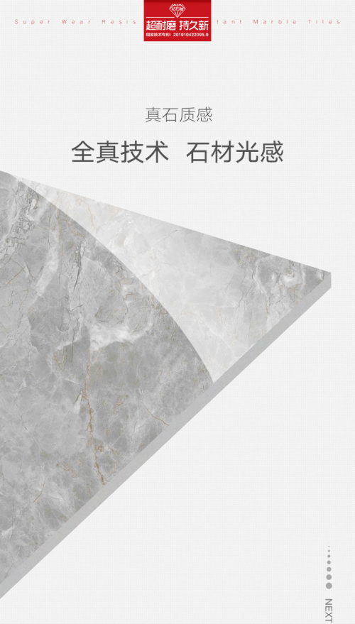 為了解決大理石瓷磚不耐磨的行業痛點,實現瓷磚“永葆青春”,大角鹿科研團隊與全球第一的釉料公司,意大利卡羅比亞釉料通力合作,經過數年研發、測試,大角鹿獨創出全球首個為耐磨瓷磚而研發的“超耐磨鉆石釉”專利技術,并獲得國家專利技術認證,實現了瓷磚產品耐磨度的大幅提升。之后,大角鹿加快研發創新的步伐,全面升級超耐磨技術,推出“第2代微雕超耐磨鉆石釉”技術,使得耐磨指數全面提升到了6000轉以上,與普通瓷磚相比,耐磨度達3倍以上且防滑性能達到A級,徹底實現了耐磨指數和防滑性能這兩方面的“全球絕對領先水平”,再次刷新全球耐磨新高度。