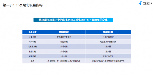 北極星指標(biāo)是企業(yè)業(yè)務(wù)目標(biāo)和企業(yè)用戶價(jià)值的交集。舉個(gè)例子,很多視頻網(wǎng)站他們的核心就是靠廣告變現(xiàn)的,對(duì)于他們而言,從短期目標(biāo)角度來(lái)講,肯定是要提升廣告營(yíng)收。更多時(shí)候短期目標(biāo)可能定位于提升用戶廣告點(diǎn)擊率等等。但是通過(guò)進(jìn)一步思索視頻網(wǎng)站可以給用戶提供的場(chǎng)景價(jià)值就會(huì)發(fā)現(xiàn),對(duì)用戶來(lái)講,他們的訴求就是得到樂(lè)趣。從這個(gè)角度來(lái)說(shuō),視頻網(wǎng)站真正的北極星指標(biāo)應(yīng)該是這個(gè)網(wǎng)站的使用時(shí)長(zhǎng)。