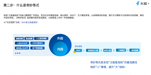 能夠影響北極星指標(biāo)的核心要素是非常多的。以現(xiàn)在比較火的社區(qū)團(tuán)購(gòu)為例,用戶在平臺(tái)下的訂單越多,意味著用戶從社區(qū)團(tuán)購(gòu)獲得的價(jià)值越多,并且社區(qū)團(tuán)購(gòu)也是一個(gè)企業(yè)長(zhǎng)期商業(yè)價(jià)值的基礎(chǔ),所以GMV是一個(gè)衡量標(biāo)準(zhǔn)。對(duì)于有些業(yè)務(wù)來(lái)講,可能并不具備像GMV這樣非常有導(dǎo)向性的目標(biāo),但是也可以“以用戶旅程為主線提升奇妙等式”。