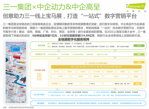 在艾瑞咨詢發布的《2020年中國企業數字化轉型路徑實踐研究報告》中,中企高呈作為一站式數字化轉型服務商入選2020中國企業數字化轉型服務產業圖譜。同時,《報告》收錄了中企高呈打造的“創意助力三一線上寶馬展,打造‘一站式’數字營銷平臺”應用案例 , 為企業數字化轉型提供更多實踐參考,充分展現中企高呈在全鏈路數字化轉型服務領域的突出能力和行業代表性地位。