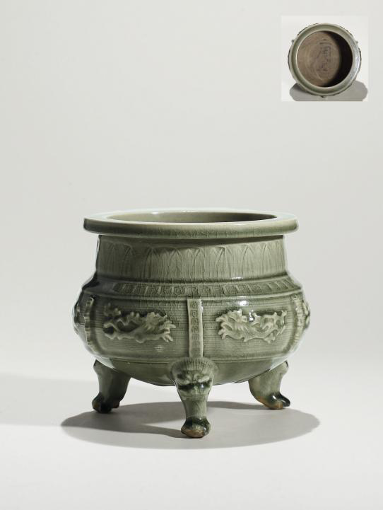 耀州窯貼花夔鳳紋三獸足爐