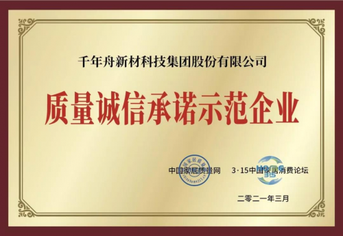 在中國質量報刊社主辦的2021年「3·15中國家居消費論壇暨質量誠信承諾宣言」主題活動中,千年舟榮獲“全國產品和服務質量誠信示范企業”稱號,體現了廣大消費者朋友們對千年舟的信賴和認可!