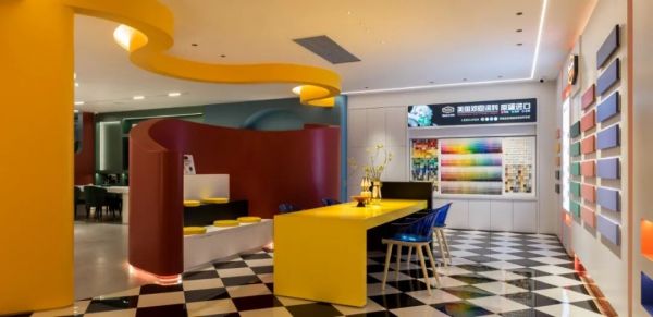 改造前的店鋪為傳統的涂料銷售門店,店鋪空間凌亂,對于往來家具城的人而言,并沒有很強的吸引力。設計師張天將門店全面升級,旨在打造一個多元體驗的色彩博物館,顧客不但可以了解品牌和涂料的相關知識,亦能沉浸體驗色彩的無限魅力。