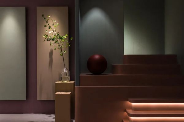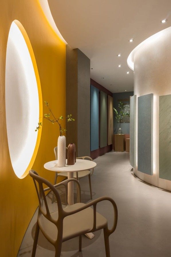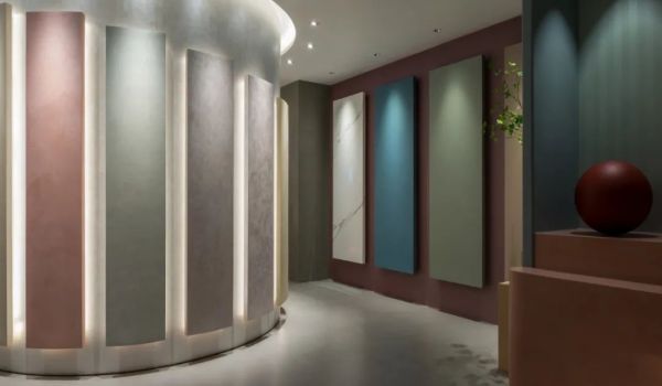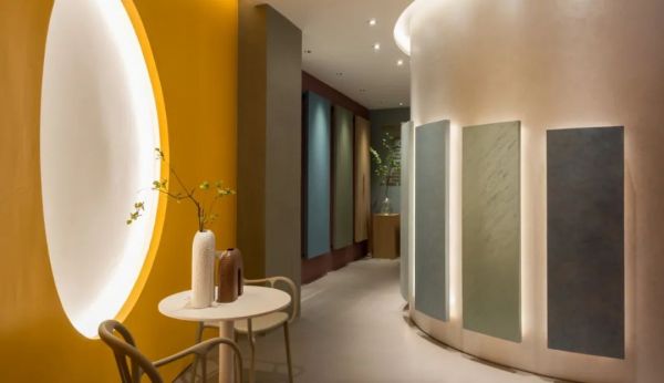 處于展廳中心位置的圓形獨立空間,專門設置了沉浸式產品試驗區,通過多重手段對比、分析,給客戶全新的購物體驗。沉浸體驗區的外墻面為材料展示提供了絕佳空間,結合商業空間設計可持續的大命題,張天將藝術涂料展示在一塊塊浮起的石膏版上,極大的方便了后期更換展示商品。涂料展示板排列高低有序,燈光恰到好處地勾勒出紋理,傳統的展示墻面被賦予了靈動之美。