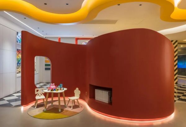 張天最終選定了利用“S”形的完美弧線,過渡兩個相對獨立空間,銜接起舒緩與熱烈的“樂章”。“S” 形隔墻自然形成了兩個半封閉空間,一邊作為兒童游樂區,吸引淘氣寶寶,讓購物不再分心;一邊設置為沙龍活動區,用于承接各種小型活動。