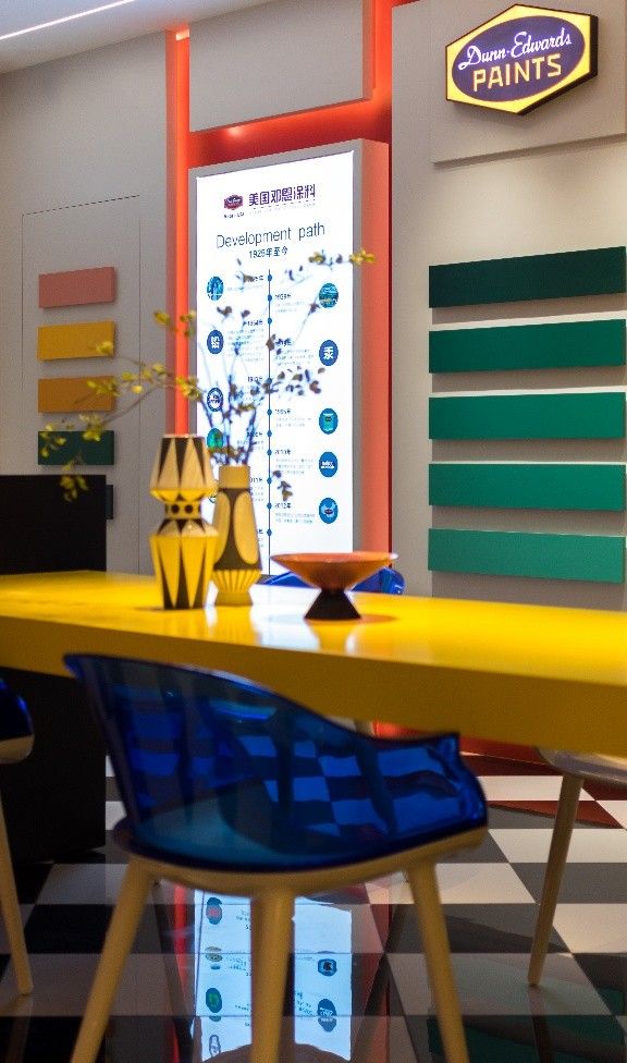 展廳空間打破局限,向外生長、延續,在展廳對外的2個入口處,持續釋放出“誘人”的訊號。美國鄧恩涂料入口開放,大面積的黃色涂料墻在大的場域中形成視覺焦點,弧形墻面的向內彎折角度極具引導性,使人不由向內窺探;黑白菱格鋪設的地面在濃烈色彩的映襯下,迸發出強烈反差,給了游客一個“一探究竟”的理由。