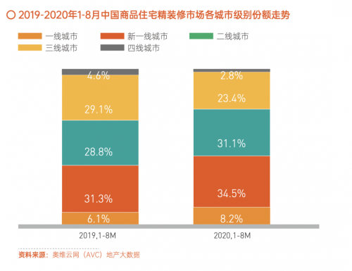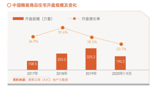 2020年,受疫情以及調(diào)控影響,房地產(chǎn)行業(yè)總量萎縮、 利潤空間侵蝕是大概率事件,總體景氣度下降,開發(fā)商推進精 裝房的意愿降低,整體精裝修市場增長受牽掣。根據(jù)奧維云網(wǎng) (AVC)地產(chǎn)大數(shù)據(jù)顯示,2020年1-9月,商品住宅精裝修樓 盤開盤項目2228個,同比-16.6%;市場規(guī)模190.2萬套,同比 -20.7%。從城市能級來看,2020年1-8月精裝修配套建材市場 中,新一線城市占比為34.5%,新一線城市份額微增,精裝修 配套建材市場回歸高能級城市。未來,伴隨房地產(chǎn)行業(yè)平穩(wěn)發(fā) 展,全裝修政策在全國大面積推行以及精裝滲透率、市場規(guī)模 不斷提升的多重驅(qū)動下,精裝修行業(yè)的市場機會依然可觀。