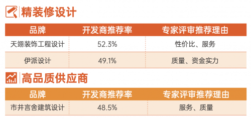 從評選結(jié)果看,金螳螂以超過60%的高開發(fā)商推薦率位列第一,廣田集團、亞廈裝飾因質(zhì)量高、服務(wù)好以及資金實力強獲得超過50%的開發(fā)商推薦率。從開發(fā)商推薦率來看,在塑造 產(chǎn)品力成為行業(yè)共識的背景下,質(zhì)量成為開發(fā)商選擇推薦精裝修企業(yè)時看重的關(guān)鍵因素。