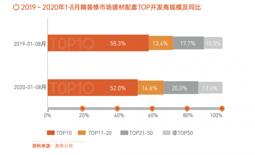 在開發(fā)商一端,近年來隨著地價走高,樓價也不斷增長, 為了平穩(wěn)地價成本,通過精裝修提升產(chǎn)品的附加值來提升樓價 成了更多地產(chǎn)商的選擇。但由于頭部開發(fā)商精裝房滲透率逐步見頂,腰部房企的精裝修滲透率仍在快速提升,行業(yè)呈現(xiàn)排名 靠后但增速越高的趨勢。2020年1-8月精裝部品在住宅樓盤的集中供應(yīng)中,TOP10房企配套量份額占比為52%,較去年同期有 所下滑,腰部房企11-20強、21-50強、50-100強的精裝部品在 精裝修住宅樓盤的應(yīng)用,較去年同期均有小幅上漲。