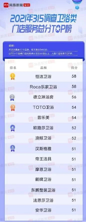 網(wǎng)易家居315家居服務(wù)調(diào)查結(jié)果提前放榜,再次引起了廣大消費者的關(guān)注。其中,消費者普遍非常衛(wèi)浴行業(yè)《2021網(wǎng)易家居315家居服務(wù)調(diào)查報告-衛(wèi)浴篇》結(jié)果顯示,恒潔衛(wèi)浴再次斬獲2021“315調(diào)查衛(wèi)浴類綜合得分TOP榜”、“315調(diào)查衛(wèi)浴類門店服務(wù)總分TOP榜”兩大榜單榜首位置。這是繼2020年斬獲“雙料冠軍”后,恒潔衛(wèi)浴又一次衛(wèi)冕“雙料冠軍”。這也從側(cè)面證實了恒潔衛(wèi)浴自身的實力和品質(zhì)!