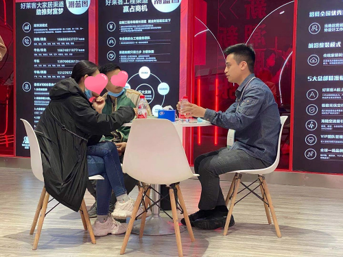 好萊客藝術整裝洽談區吸引了眾多意向加盟商火熱咨詢,現場招商人員耐心講解了藝術整裝模式核心優勢。