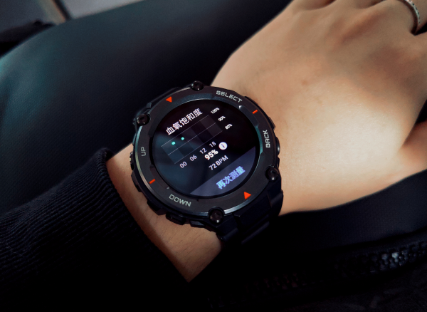 Amazfit T-Rex Pro 較上一代還有一個非常明顯的提升——增加了血氧檢測功能。喜歡玩戶外的人都知道,在高原或者山區,每一米的海拔爬升,都伴隨著多一份風險的挑戰。Amazfit T-Rex Pro 搭載了高度計和血氧引擎,會及時依據高度變化提醒我們進行血氧飽和度檢測,讓我們清楚地知道身體的適應能力和極限,避免傷害。