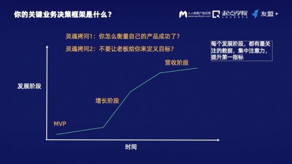 很多老板未必可以在當下設定一個非常合理的目標;一旦設定一個目標,你被迫或者被動去接納了這個目標以后,接下來的工作會變形,因為任何一個產品都有不同的產品所處的生命周期階段——從MVP 、增長再到穩定的變現營收階段,核心點都是不同的。