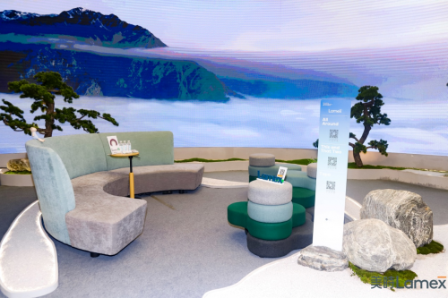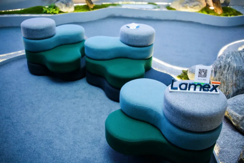 展會以自然的方式呈現辦公場景,有二次創作的動態山水畫,有咖啡渣回收制成的產品,有美時家具帶來親自然設計的二款全球首發新品,Playces 休閑系列產品,還有布滿苔蘚和綠植生態的環境。讓我們一起感知與生命對話的美妙,探索未來辦公的親自然和環保屬性。