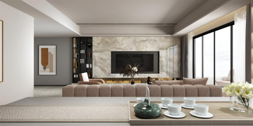 客廳設(shè)計(jì)流暢優(yōu)美,暖色大理石花紋的電視墻配上火爐,讓深冬寒流的夜晚,亦可安然享受家的溫暖和溫馨。大大的落地窗融入無限光景,和室內(nèi)米色布藝沙發(fā)和白墻融為一體,到了夜幕降臨之后,城市外的光影也成為家的一部分。