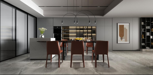 客來福全屋定制奧菲系列設(shè)計(jì)以黑、白、灰三色為主要基調(diào),灰色的墻面、白色大理石地板和黑色為點(diǎn)綴的餐桌、電視柜、收納柜、餐邊柜等軟裝家具,在視覺上拉伸構(gòu)造,增加空間距離感,黑色嵌入式電視墻的設(shè)計(jì)很好地吸引了人們的視覺注意力,讓小家看起來更大,同時滿足簡約風(fēng)格的基礎(chǔ)上,更凸顯現(xiàn)代時尚輕奢。