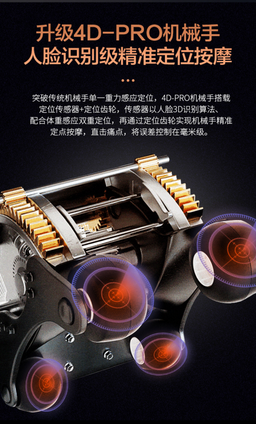 歐利華A8909裝的有定位齒輪,毫米級(jí)的,所以機(jī)械手移動(dòng)的時(shí)候卡位特別準(zhǔn)。而且有專門的定位傳感器配合體重感應(yīng)雙重定位,還可以通過人臉識(shí)別鎖定每一個(gè)用戶的個(gè)人信息,像專業(yè)按摩師一樣不光認(rèn)識(shí)客戶,還記得住每個(gè)客戶的喜好,穴位找得準(zhǔn),力度卡得準(zhǔn),按起來自然舒服。