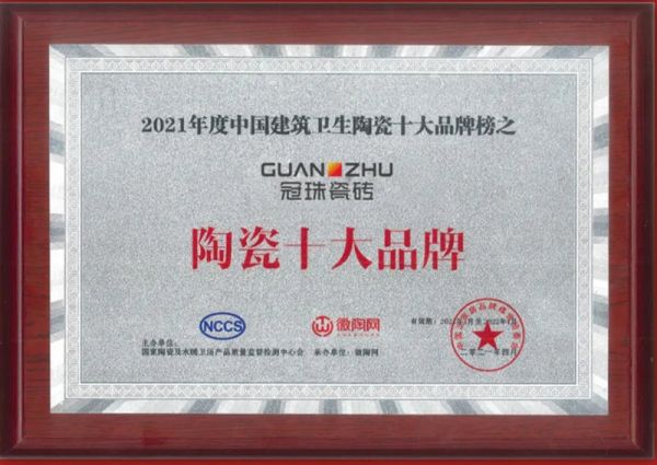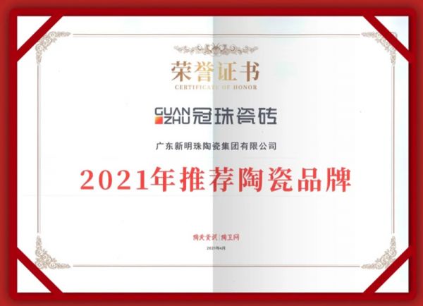 近日,冠珠瓷磚喜訊不斷,于4月6日、7日分別斬獲“2021年推薦瓷磚品牌”、“2021年度中國建筑衛生陶瓷十大品牌榜之陶瓷十大品牌”。