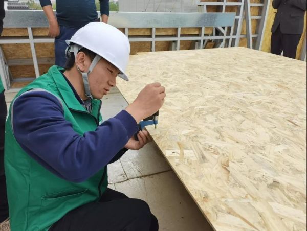 2021年4月20日,千年舟綠色工程行公開檢測項目再次啟動,走進由安徽乾業建筑工程有限公司承建的安徽杰愛新材料股份有限公司綜合樓項目,該項目是用千年舟OSB/3型板材建造的輕鋼別墅。