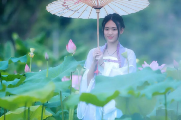 數把水墨油紙傘與綻放荷花遙相呼應,