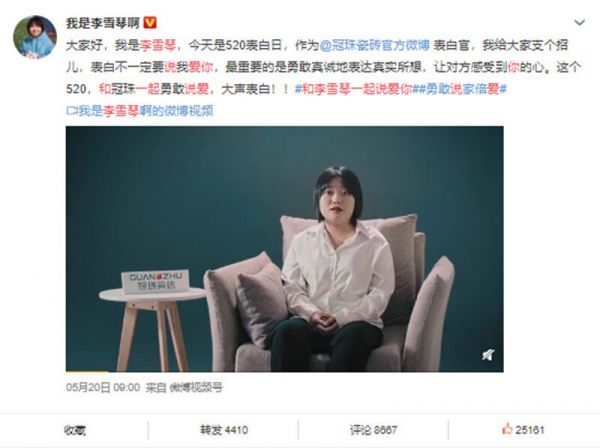 這個由冠珠瓷磚傾情策動的“520告白”活動,聯手脫口秀演員李雪琴,成功打破慣常認知,刷新“520告白”內涵,實力出圈,登陸熱搜榜,過億網民圍觀點贊!