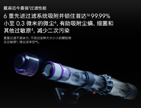 除了清潔能力很強之外,戴森V11還有著很強的過濾系統,6重先進的過濾系統可以吸附并鎖住首達99.99%的微塵,可以有效地放置二次污染。避免二次污染是非常重要的事情,如果整個機器過濾系統不能高效密封到位,那么細小的灰塵就會飄到空氣之中,甚至直接飛到人的臉上。特別是當過濾網已經過載了之后,灰塵就會從機器的各個角落飛出來,而使用了戴森V11之后就完全沒有了這個困擾。
